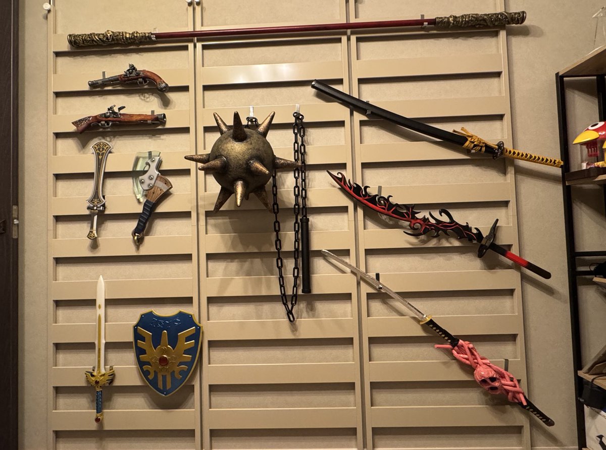 狩野さんのディスプレイに「世紀末が来ても大丈夫そうですね」「魔哭鳴斬剣が最高ですね」「NEW如意棒飾ってあるwww」「ロトシリーズの飾り方も素晴らしい!!!」「武器屋商人のお部屋。並べ方センス良いですね」「武器庫!配置天才です」などの声が寄せられています。