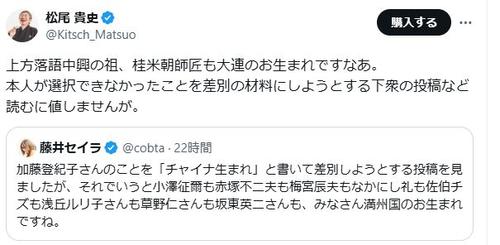 松尾は藤井氏のポストを引用し、「上方落語中興の祖、桂米朝師匠も大連のお生まれですなあ」とした上で、「本人が選択できなかったことを差別の材料にしようとする下衆の投稿など読むに値しませんが」と高田氏のポストを批判した。