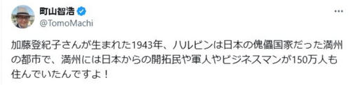 映画評論家の町山智浩氏も、高田氏のポストを引用し「これにレスして『加藤登紀子は中国人』と言ってる連中がハルビンが日本の植民地・満州だったことも知らない、本当に本当にひどい人たちなので、何とかしてください。あまりにひどすぎる。日本はもうどうかしてる」と憤り、「加藤登紀子さんが生まれた1943年、ハルビンは日本の傀儡国家だった満州の都市で、つまり政治的には日本で、満州には日本人が150万人も住み、加藤さんの父は関東軍特務機関や南満洲鉄道に勤務した日本の政府職員でした。登紀子さんは終戦時2歳で日本に引き揚げました」と解説した。