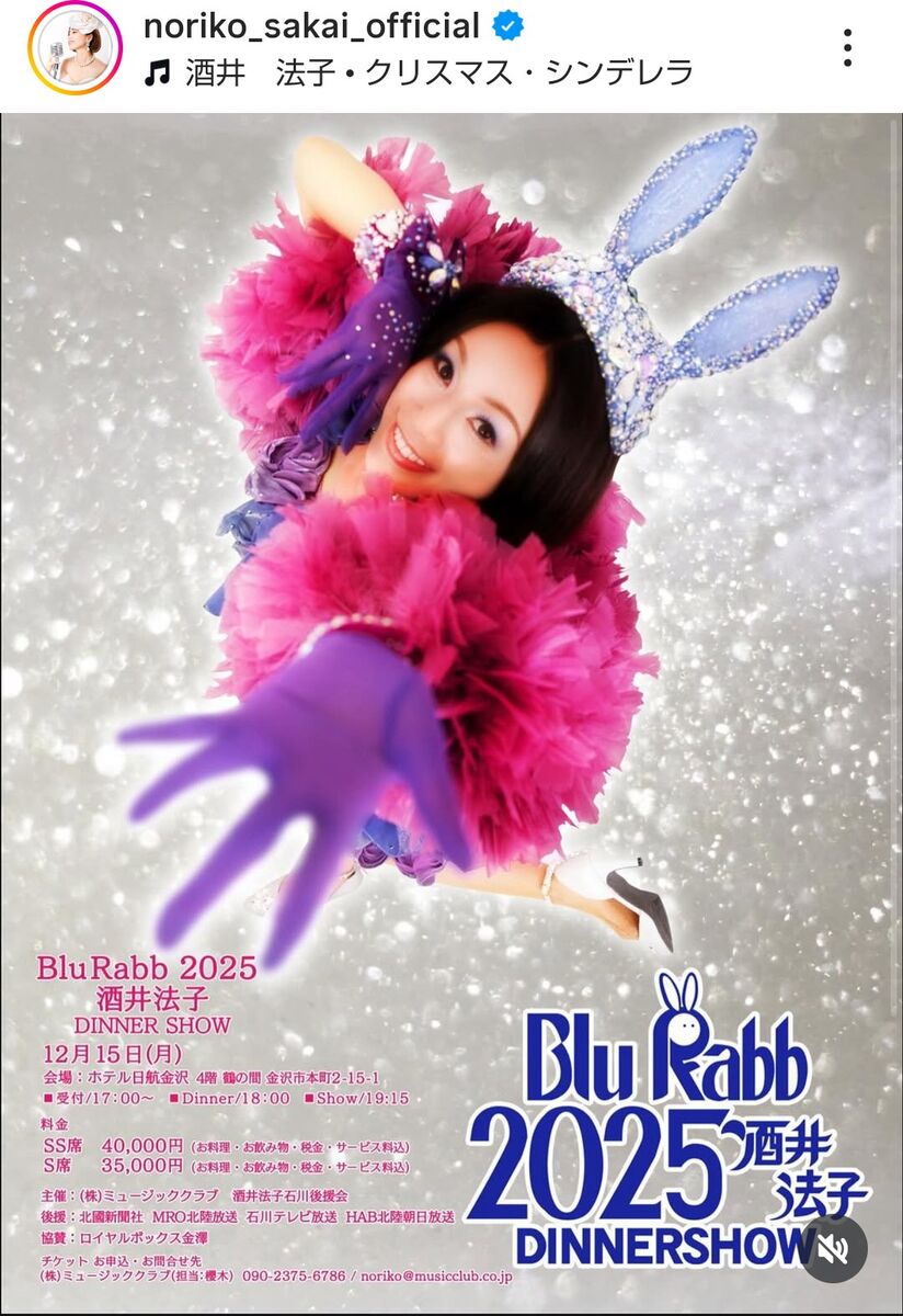 酒井は2日までに、「クリスマスディナーショー2025」を開催することを発表。12月15日に石川・ホテル日航金沢、同22日に大阪のリーガロイヤルホテル大阪で行う。