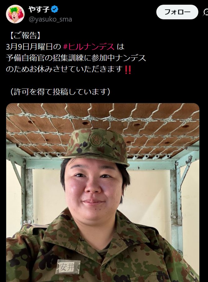@livedoornews【報告】やす子、9日の『ヒルナンデス!』欠席へ 「予備自衛官の招集訓練に参加中」 news.livedoor.com/article/detail… やす子は過去にテレビ番組で「また即応予備自衛官になって、月1で訓練に行く」と明かしていた。即応予備自衛官は技能や知識維持のため、年間30日の訓練に応じる必要がある。 pic.x.com/kpDyeTQhic
