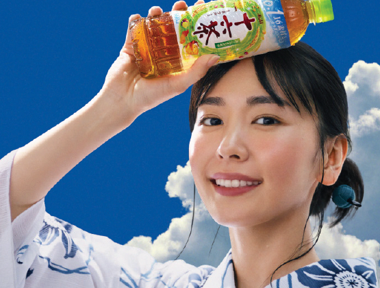 白地に青色の花柄の浴衣姿で、ペットボトルの十六茶を手にしておでこにあてている様子をアップしたのは、アサヒ飲料の公式X。